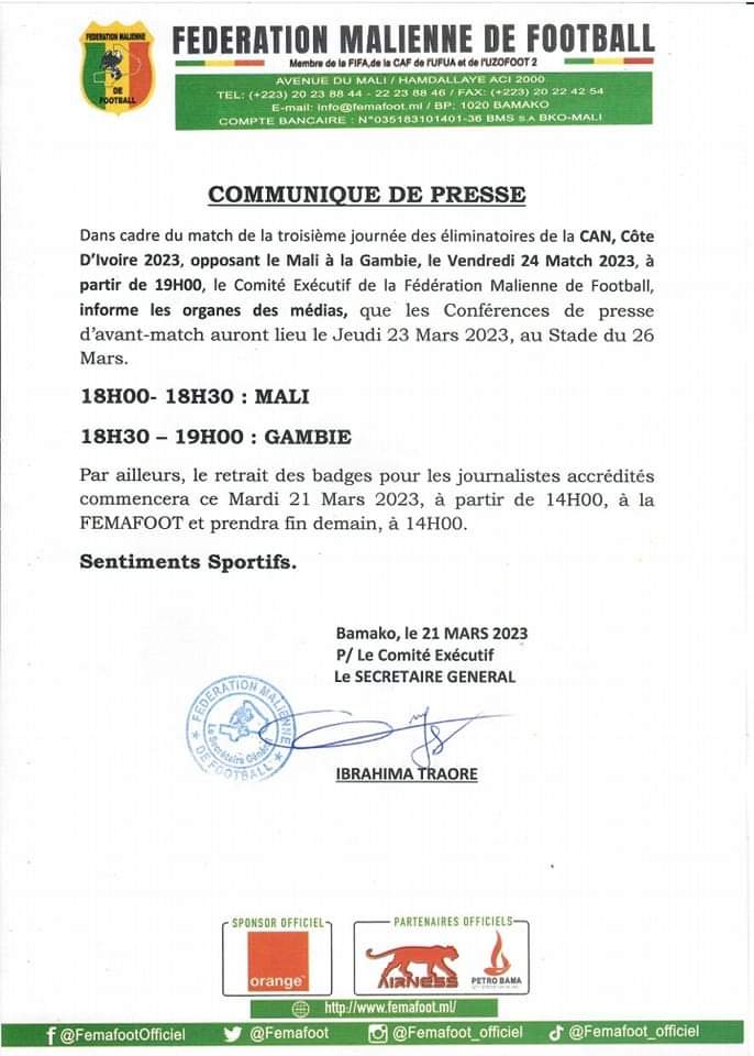 À 48 heures de l’affiche Mali/Gambie au compte de la 3e journée des éliminatoires de la CAN 2023, le communiqué de presse pour l’avant match, qui , circule sur les réseaux sociaux est truffé d’incorrection .